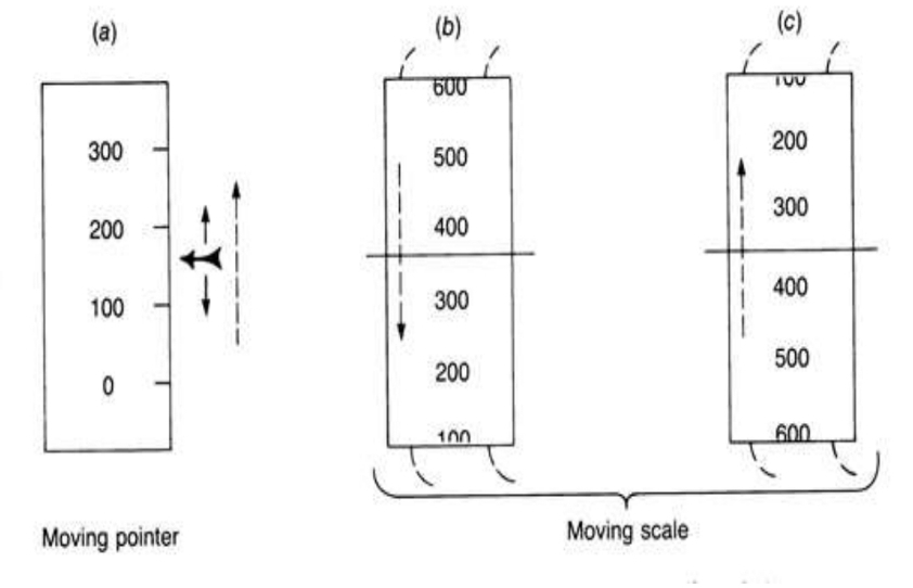 4. 다음 그림과 같이 지시계를 설계할 때 이동지침(moving pointer)과 이동눈금(moving scale) 사용의 장·단점을 인간공학적 측면에서 원리를 설명하시오.